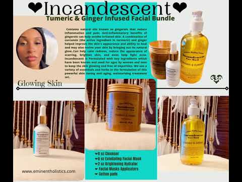 ♥Turmeric contains antioxidants and anti-inflammatory components. ♥ Ginger contains natural oils known as gingerols that reduce inflammation and pain. Anti-inflammatory benefits of gingerols can help soothe irritated skin. A combination of curcumin (the active ingredient in turmeric) and ginger helped improve the skin's appearance and ability to heal and may also revive your skin by bringing out its natural glow..Can help calm redness, reduce the appearance of scarring, brighten skin, and even help fight acne. Incandescent is Formulated with key ingredients which have been known and used for ages by women and men to keep the skin glowing and free of impurities. We use a variety of essentials and herbs in the formulation of this powerful skin toning anti aging, moisturizing treatment set.